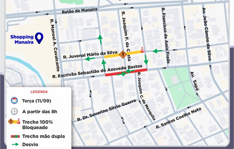 A Superintendência Executiva de Mobilidade Urbana (Semob-JP) anunciou que a Rua Juvenal Mário da Silva, no bairro de Manaíra, em João Pessoa, será bloqueada nesta quinta-feira (11) devido a obras de expansão da rede de esgotamento sanitário da Cagepa.