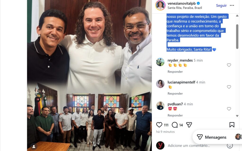 A adesão foi tornada pública pelo próprio Veneziano, que utilizou as redes sociais para celebrar o apoio. Segundo o senador, além do prefeito, vereadores e lideranças políticas do município também declararam apoio ao seu projeto de reeleição.