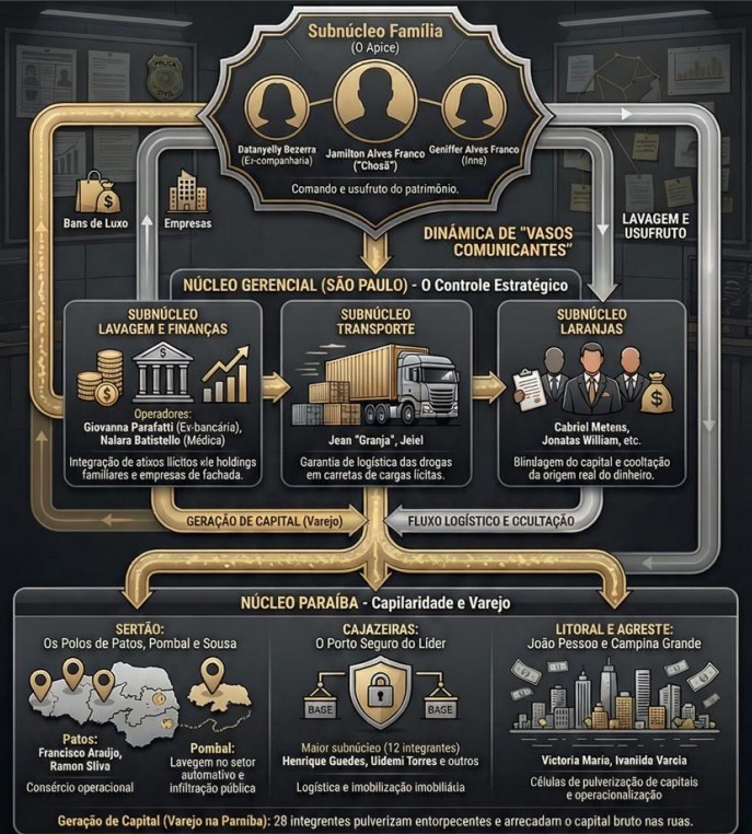 A investigação identificou que a organização era dividida em núcleos especializados. Um setor cuidava do transporte das drogas em carretas de empresas legais para camuflar os entorpecentes. Outro núcleo fazia a distribuição interna na Paraíba. Já o braço financeiro operava um sofisticado esquema de lavagem que movimentou cerca de meio bilhão de reais desde 2023.